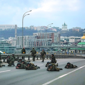 2月25日,乌克兰国民警卫队的士兵在基辅市中心的公路上布防。