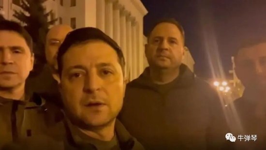 夜色中,基辅街头,身着迷彩服的总统,亲自拿着手机,身边是多名乌克兰高官。他对着手机镜头说:我们在这里。我们在基辅。我们正在保卫乌克兰。