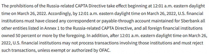 对Sberbank的制裁是不允许它在美国的银行开设代理行账户(Correspondent Account or Payable-through Account),这种制裁也称作“上了CAPTA List”。