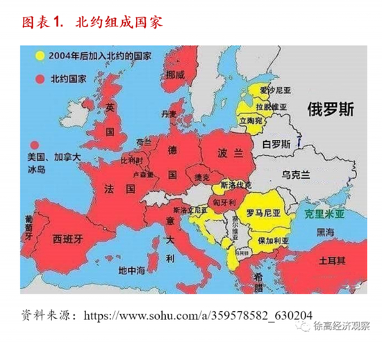 2022年2月24日爆发的俄罗斯与乌克兰的战争(俄乌战争)震惊了世界,严重冲击了全球金融市场。2月26日,欧美国家宣布将禁止俄罗斯几家主要银行使用环球同业银行金融电讯协会(SWIFT)的国际结算系统,同时限制俄罗斯央行对其外汇储备的使用。此举让欧美国家对俄罗斯的制裁力度上升到了前所未有的高度,让局势变得更加复杂。因此,尽管全球市场已从俄乌战争爆发伊始时的震惊中有所恢复,未来仍然还会受到冲击。俄乌战争是北约持续东扩,挤压俄罗斯战略空间和生存空间的结果。北约的全称是北大西洋公约组织(简称NATO)。它是美国与西欧国家于1949年创设的,与苏联所领导的华约集团相对抗的军事集团。北约虽然是美苏冷战的产物,但在苏联解体、华约集团解散之后却并未消失,反而步步东扩,不断将原华约成员国和苏联加盟共和国纳入其中,将其势力范围推进到俄罗斯边境线上。北约如果再将乌克兰纳入,其兵锋将直指俄罗斯腹地。可以说,北约东扩至乌克兰是将俄罗斯逼到了墙角,迫使俄罗斯不得不奋力一搏。(图表 1)