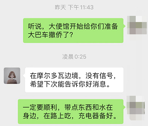她告诉我们,她人已在摩尔多瓦边境,手机信号时有时无,“希望下次能告诉你好消息”。