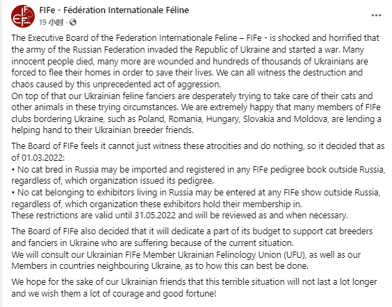 3月1日,猫科动物国际联合会(FIFe)在官方社交媒体账号宣布“制裁”俄罗斯,呼吁本机构下属的各国分会停止进口饲养于俄罗斯境内的猫,并禁止与俄罗斯有关联的机构参加该组织举办的展会和比赛。