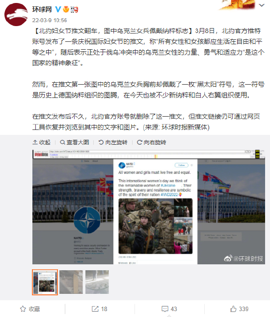 [北约妇女节推文翻车,图中乌克兰女兵佩戴纳粹标志]3月8日,北约官方推特账号发布了一条庆祝国际妇女节的推文,称“所有女性和女孩都应生活在自由和平等之中”,随后表示正处于俄乌冲突中的乌克兰女性的力量、勇气和适应力“是这个国家的精神象征”。 然而,在推文第一张图中的乌克兰女兵胸前却佩戴了一枚“黑太阳”符号,这一符号是历史上德国纳粹组织的图腾,在今天也被不少新纳粹和白人右翼组织使用。 在推文发布后不久,北约官方账号就删除了这一推文,但推文链接仍可通过网页工具恢复并浏览到其中的文字和图片。(来源: 环球时报新媒体)