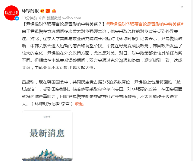 尹锡悦对华强硬言论是否影响中韩关系?专家:不太可能出现大起大落