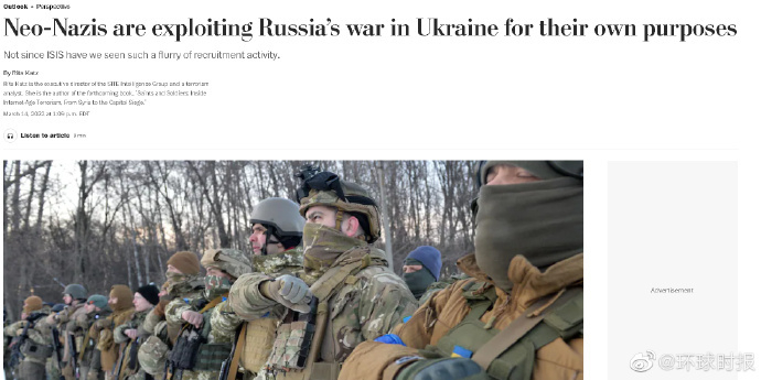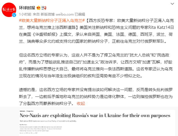 美国关注新纳粹和恐怖主义问题的专家Rita Katz14日在美国《华盛顿邮报》上撰文,承认来自英国、美国、法国、德国、西班牙、波兰、荷兰、瑞典等众多北约或支持北约国家的新纳粹分子,正前往乌克兰对付俄罗斯军队。
