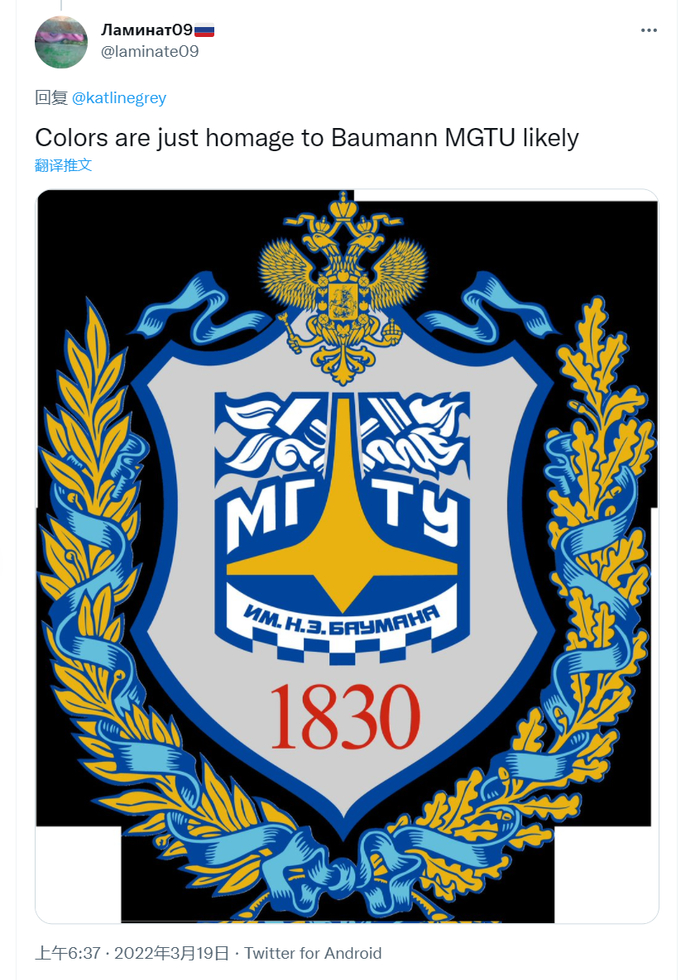 关于外媒将俄罗斯宇航员航天服与乌克兰国旗配色联系在一起的解读,一些网友认为这和莫斯科国立鲍曼技术大学有关↓