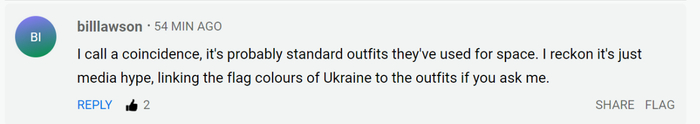 “我称之为巧合,这可能是他们在太空中穿的标准服装。我觉得这只是媒体炒作,把乌克兰国旗的颜色和服装联系在一起。”