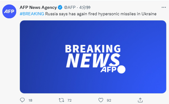 外媒:俄方称再次向乌克兰发射高超音速导弹