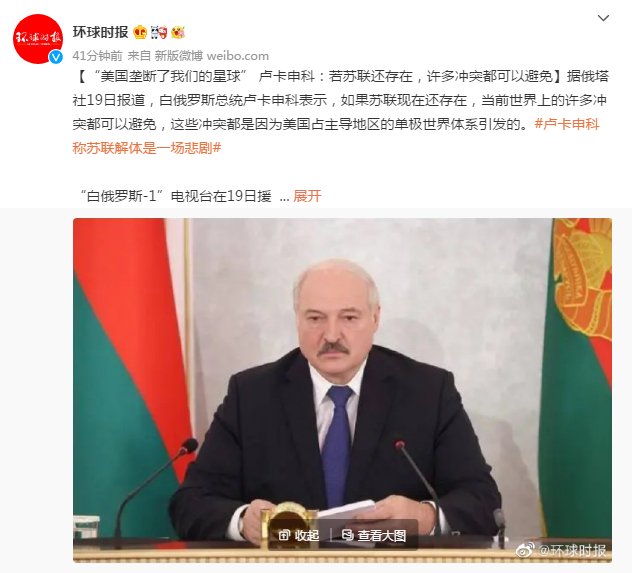 “白俄罗斯-1”电视台在19日援引卢卡申科接受日本TBS电视台采访的话称,“如果苏联到今天依然存在,那我们就可以避免世界上各种各样的冲突。西方和美国总是不得不考虑苏联的立场。世界之前是多极世界,一极平衡另一极。现在世界上所发生事情的原因是单极,美国垄断了我们的星球。”