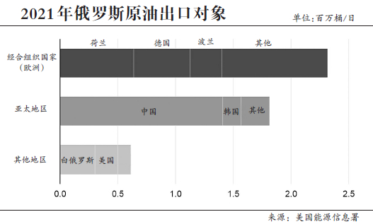 据俄罗斯联邦海关总署的数据,2021年俄罗斯出口原油近2.3亿吨,供应给世界36个国家。自2017年以来中国一直是俄罗斯石油的最大买家。2021年中国从俄罗斯购买7010万吨石油,占俄罗斯出口总额约三成。荷兰和德国排名第二、三位。