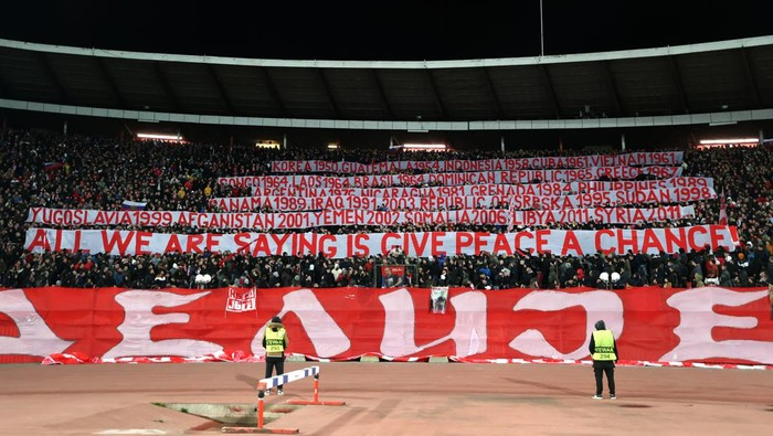 在当地时间3月17日欧罗巴联赛16强第二回合比赛中,塞尔维亚的主场球迷高举6条巨大横幅,按年份细数美国、北约组织过去直接(或间接)参与入侵的20多个国家。其中一条横幅则写着“我们想说的是,给和平一个机会!”