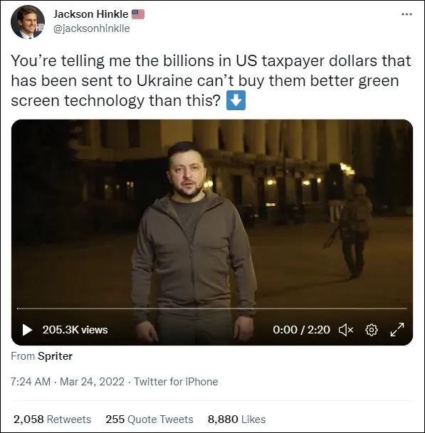 还有人讽刺道,“美国纳税人送去乌克兰的数十亿美元买不到比这更好的绿幕技术了吗?”