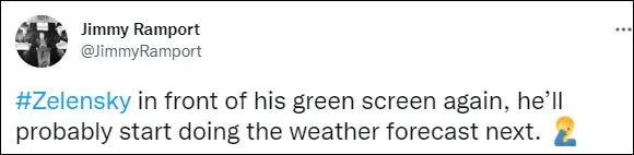 一位网友讽刺道,“泽连斯基又在绿幕前录视频了。之后他要开始搞天气预报了。”