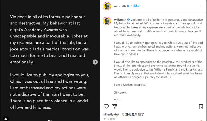 威尔-史密斯道歉 ,“掌掴事件”继续发酵