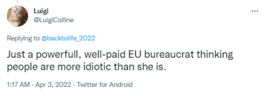 一名意大利网友表示,“这只是一名有权有势、收入丰厚的欧盟官员认为人们比她更白痴(的言行)。”另一位意大利网友还顺着维斯塔格的话嘲讽道,“今天我洗了一生中最长的热水澡,唱着,‘接招吧,欧盟!’”↓