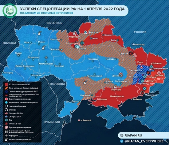 分析认为,俄军的最低目标“小目标”应该是拿下乌东两个亲俄的州全境,因为俄罗斯承认这两州“独立”时,两州亲俄武装所控制的地区,实际只有行政区划的三分之一。俄军的高一级的目标“中目标”应该是控制乌东,这又分为两种情况,一种是拿下乌东南的亲俄区,把乌克兰变成内陆国。另一种是划河而治,实现第聂伯河以东的实际控制。俄军的最乐观目标“大目标”,自然就是在整个乌克兰扶持成立一个亲俄的政府。不过俄军基辅撤退也表明,俄军已经事实上被迫放弃这个难度最高的目标。