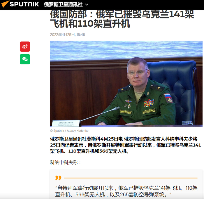 对比一下,俄军方25日最新通报的战果:击落乌战机141架、265套防空导弹系统。