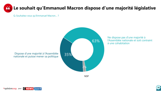 报道称,民调结果显示,超六成(63%)法国受访者不希望马克龙所在的执政党共和国前进党在即将于6月举行的法国国民议会选举中获胜,仅有35%的受访者希望该党获得多数席位。↓
