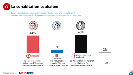 当被问及支持谁担任法国总理职位时,46%的人选择了法国极右翼政党“国民联盟”的人玛丽娜·勒庞,44%的人选择极左翼政党“不屈法国”党的让-吕克·梅朗雄,8%的人选择右翼政党共和党的瓦莱丽·佩克雷斯。↓