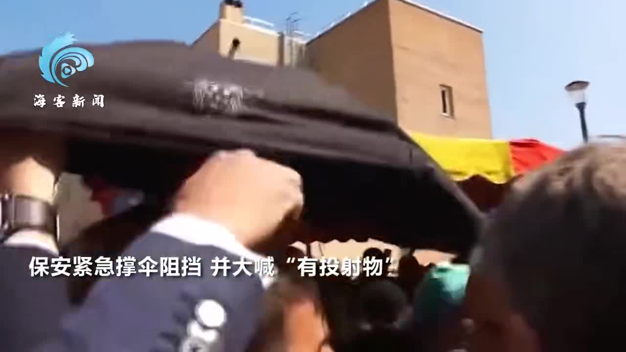 马克龙胜选后首次出行遭番茄袭击 保安撑伞大喊“有投射物”