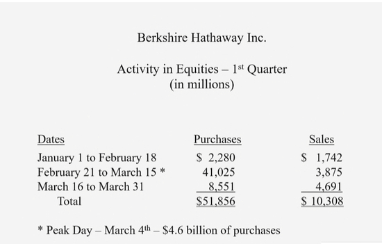 巴菲特在股东会上表示,一季度公司总共买入了518亿美元的股票,同时卖出了103亿美元。其中二月底至三月中旬期间,一口气买了410亿美元的股票。虽然现金水平大幅下降,巴菲特依然表示公司将保留足够安全的现金,公司四月以来还未展开过股票回购。