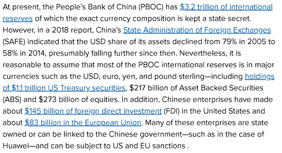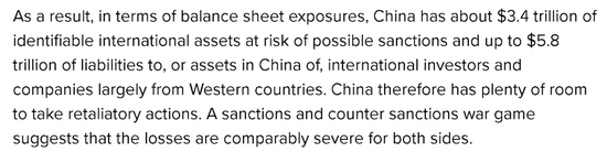 他首先列出了一些中国方面可能会直接被西方针对的资产,比如中国人民银行持有的由主流外汇、美国国债等资产构成的3.2万亿美元的外汇储备,中国企业在美国1450亿美元的直接投资以及在欧盟的830亿美元的直接投资等等。