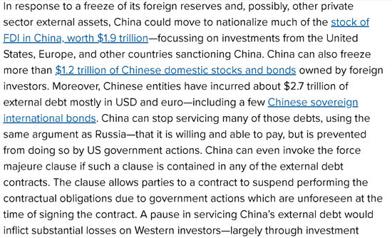 在中方的回击方面,Hung Tran推演说,如果上述这些外汇储备和企业资产被冻结,那么中方可以将外国在中国大约1.9万亿的直接投资中来自美国和西方的大部分收归国有,也可以冻结被外国投资者持有的超过1.2万亿的中国国内市场上的股票和债券。除此之外,中国还可以效仿俄罗斯,以“受西方制裁影响所以无法还债”为由,拒绝偿还由中国的实体机构和部分主权债务构成的2.7万亿美元的外债。而如果中方与外方的合同中有诸如“不可抗力”这样的条款,中国亦可以动用该条款拒绝还债。Hung Tran认为,如果中国拒绝偿还这些外债,那么这将同样给西方的投资者带来巨大的损失,尤其是国外的那些投资基金和养老金基金。
