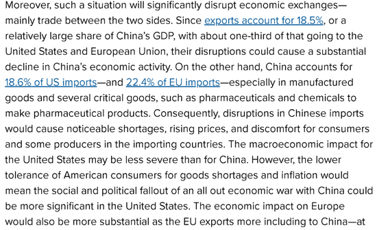 Hung Tran还进一步认为,这样一个局面还给中国和西方的双边贸易带来严重的扰乱:对于中国而言,中国18.5%的GDP来自出口,西方则占其中的三分之一,这意味着如果双方撕破脸,中国的经济将遭到严重下滑。对于西方而言,由于中国占美国进口的18.6%,占欧洲进口的22.4%,而且这些进口还以日用品等制成品和化工业和医药业需要的关键原材料为主,所以如果双方闹翻,西方就将面对供应短缺、物价上涨、以及消费者和一些需要中国产品的西方制造商的不满。