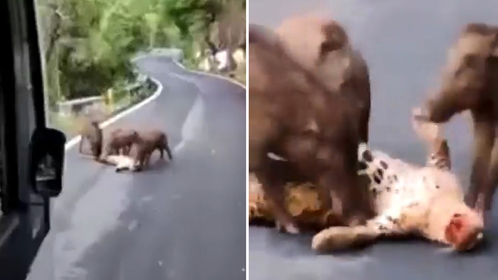 相关视频显示,3只野猪在公路上啃食豹子的尸体。视频迅速在社交媒体上流传。当地林业部门后来将豹子的尸体移走。
