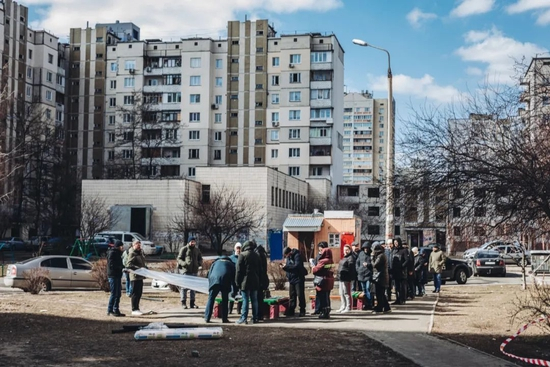 3月17日,人们在乌克兰基辅领取用来遮挡窗户的塑料布。新华社发(迭戈·埃雷拉摄)