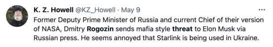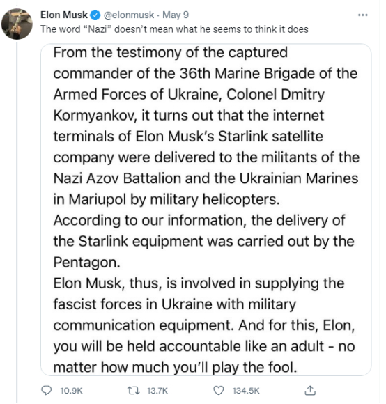 9日上午8时45分,马斯克在推特上发文称:“‘纳粹’这个词并不是像他(罗戈津)所认为的那样。”推文下面是一张文字的图片。这些文字来自罗戈津8日在Telegram的发文。罗戈津在文中表示,从被俘虏的乌克兰海军陆战队第36旅参谋长德米特里·科米扬科夫的口供来看, SpaceX“星链”卫星系统的地面终端设备,曾由军用直升机运送给“纳粹团伙‘亚速营’”的武装人员以及乌克兰海军。对此,罗戈津喊话马斯克负责。↓