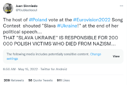 5月15日,乌克兰文化与信息部长特卡琴科在社交平台向立陶宛、波兰民众发文表示:“在欧洲歌唱大赛上,来自乌克兰的评委给你们两国选手打了零分,这是耻辱,乌克兰人给你们打12分。”