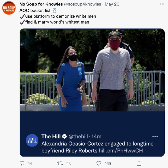 而当AOC如今与一名白人男性订婚后,虽然她的支持者都在祝福她和她的伴侣,许多厌恶她的人则嘲讽模式全开,纷纷在社交网络上调侃起她与一名白人男性订婚的选择。
