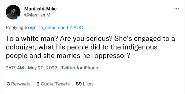 另外,还有些厌恶AOC的人希望她在嫁给一个白人男性后能真正开始关心美国普通家庭的福祉,而不是一直搞“身份政治”。