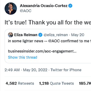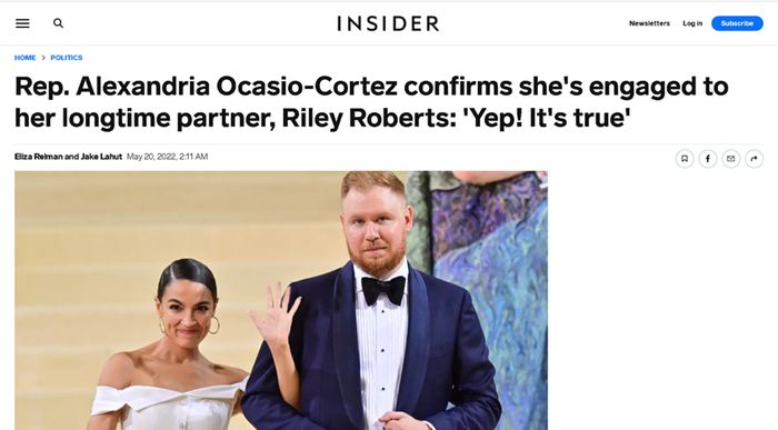 根据美国“内幕”网站的报道,AOC与白人男子莱利·罗伯茨(Riley Roberts)订婚的消息,最早是于北京时间5月19日晚间传出的。次日,AOC本人确认了这一消息。