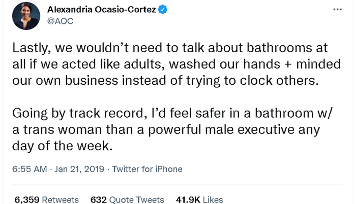 另外,她还在涉及同性恋、变性人等性少数群体的权利议题上表现得十分激进,比如支持变性人在没有做变性手术的情况下就使用异性的洗手间。