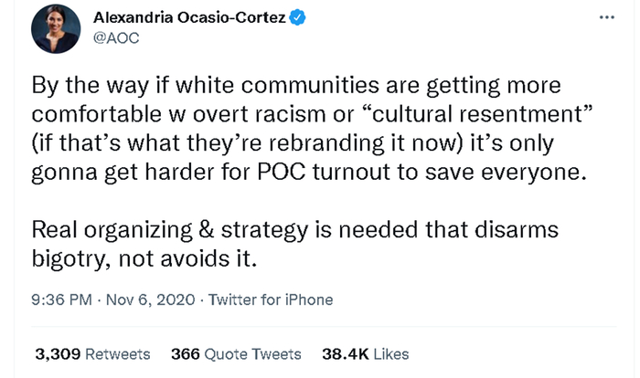 不过,自2018年赢得美国国会众议院的选举、于2019年正式成为一名民主党众议员后,AOC一直以批判美国白人的特权以及种族主义原罪等问题而出名。追随美国共和党的众多美国保守派白人男性——尤其是白人直男,更是她重点抨击的对象。