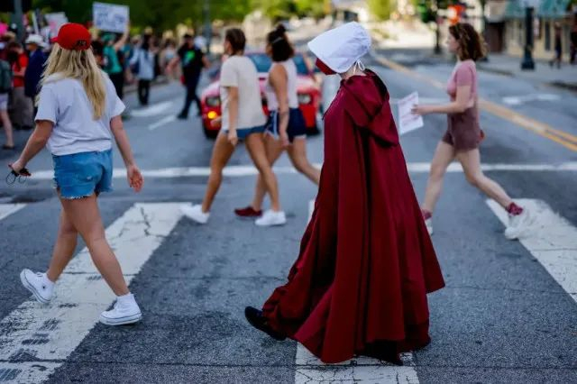 ▲当地时间2022年5月3日,美国佐治亚州亚特兰大,当地民众聚集示威,呼吁保护女性合法堕胎权利。有女性装扮为《使女的故事》中的角色。图/IC photo