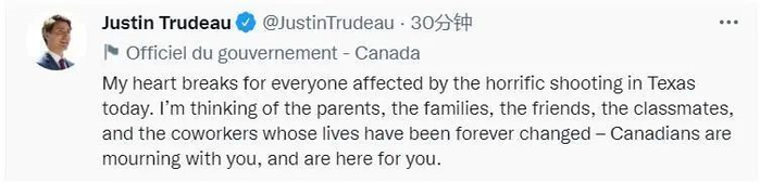 美国得克萨斯州乌瓦尔德市罗伯小学枪击事件正引发持续关注。刚刚,加拿大总理特鲁多发推,就美国得州小学枪击案受害者表示哀悼。