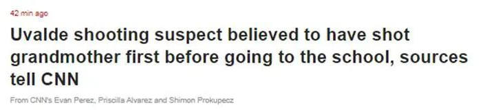 “这名年轻人枪击了他的祖母,然后逃离了现场。”古铁雷斯说。CNN称,得州州长阿博特此前也表示,“据报道,嫌疑人在去学校之前枪击了他的祖母。”