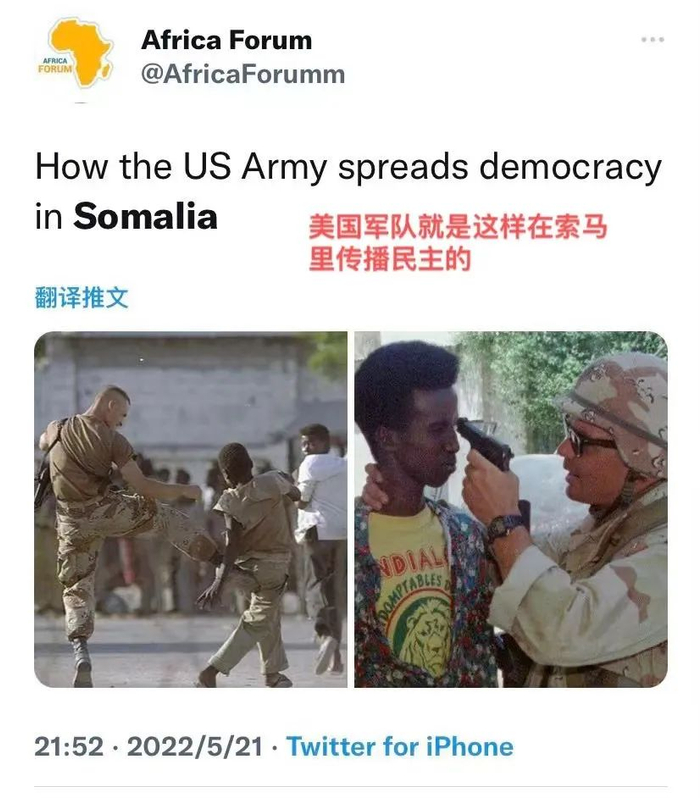 网友“Africa Forum”发帖反讽道,“美国军队就是这样在索马里推广民主的”。画面中,一位美国大兵正用枪抵着当地人的脑袋,另一位美国大兵正一脚踹向当地小男孩,并以此为乐。
