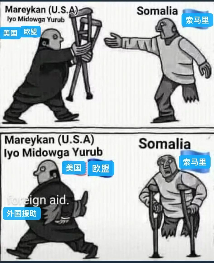 更有非洲网友为美国重新派兵索马里一事,创作了讽刺漫画,画中代表美西方国家的秃顶富商,向断了一条腿的“索马里”送来了拐杖,而代价却是打断了“索马里”的另一条腿,这样他就只能永远依靠美西方的援助了。