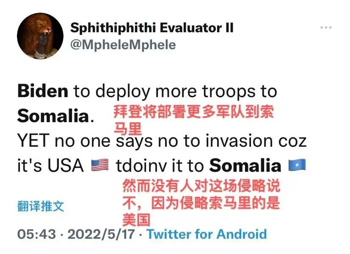 还有非洲网友直言,“然而没有人对这场侵略说不,因为侵略索马里的是美国”。