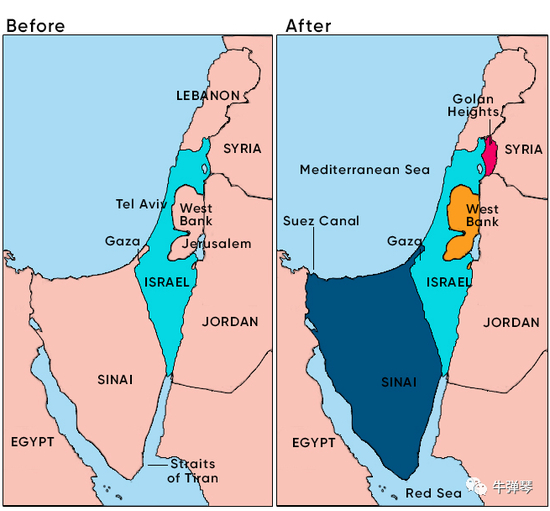 以色列不仅占领了加沙地带、约旦河西岸,而且拿下了埃及的西奈半岛、叙利亚的戈兰高地,总共约6.5万平方公里的阿拉伯人土地,彻底改变了自己的战略劣势。