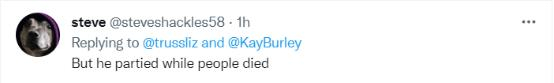 据环球网报道,当地时间6日,英国保守党议员团体“1922委员会”发布消息称,对英国首相鲍里斯·约翰逊的不信任投票将于当地时间6日18时至20时进行。据俄新社最新报道,英国外交大臣利兹·特拉斯6日发推称100%支持约翰逊,并呼吁同事们也支持首相,特拉斯称“他已为自己所犯的错误道歉”。但是英国网友对此不买账,有人评论称“在人们(因新冠病毒)死亡时他却参加派对”。(>>前情提要:“派对门”又添实锤?英媒曝光约翰逊聚会喝酒新照片)