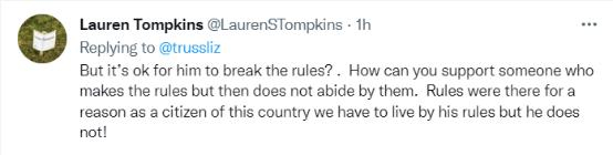 “可是他可以违反规定吗?你怎么能支持一个制定了规定但又不遵守它的人。制定规定是有原因的,作为这个国家的公民,我们必须遵守它的规定,但他(约翰逊)没有!”
