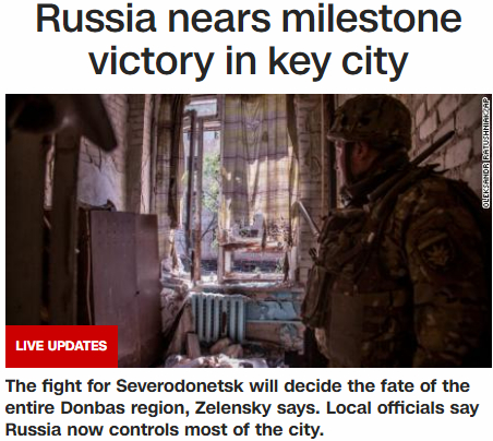 “俄罗斯在关键城市接近获得里程碑的胜利”,美国有线电视新闻网9日报道说,乌克兰东部城市北顿涅茨克的争夺战仍在激烈进行,当地官员表示,俄罗斯现在控制了该主要城市的大部分地区。