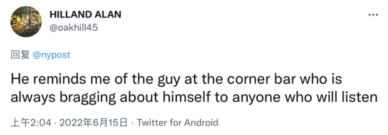 还有人评论称:“拜登让我想起了街角酒吧的那个哥们,他总是向任何愿意倾听的人吹嘘自己。”