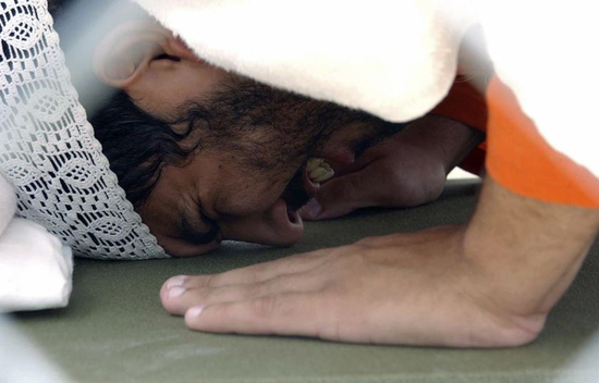 一张耐人寻味的照片,体现出囚徒入狱数月后的生活。在遭遇红十字会对囚犯待遇的激烈抗议后,关塔那摩狱方开始允许穆斯林囚徒在监狱中祷告。