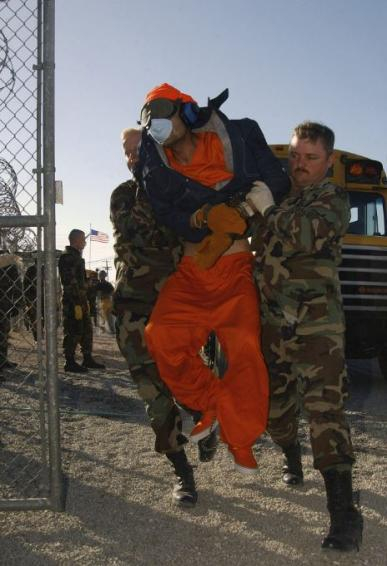 在《纽约时报》公布的一张照片中,一名刚抵达关塔那摩监狱的囚徒,像木偶一样被狱卒们抬入监狱。或许是运输途中过度疲惫,这名囚徒似乎丧失了意识,完全没有注意到自己滑落的裤子,任由狱卒在半空中摆布。